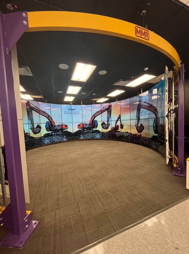 Directed by Dr. Amir Jafari and Dr. Yimin Zhu, the BIM Cave (Building Information Modeling Cave) is the heart of immersive simulation at SPICE Lab. Designed for high-impact learning and cutting-edge research in construction management, this 42-screen, semi-cylindrical display system surrounds users in a 270-degree visual environment — making it one of only two in the world of its kind. The BIM Cave is a large-scale, immersive visualization environment that allows users to: